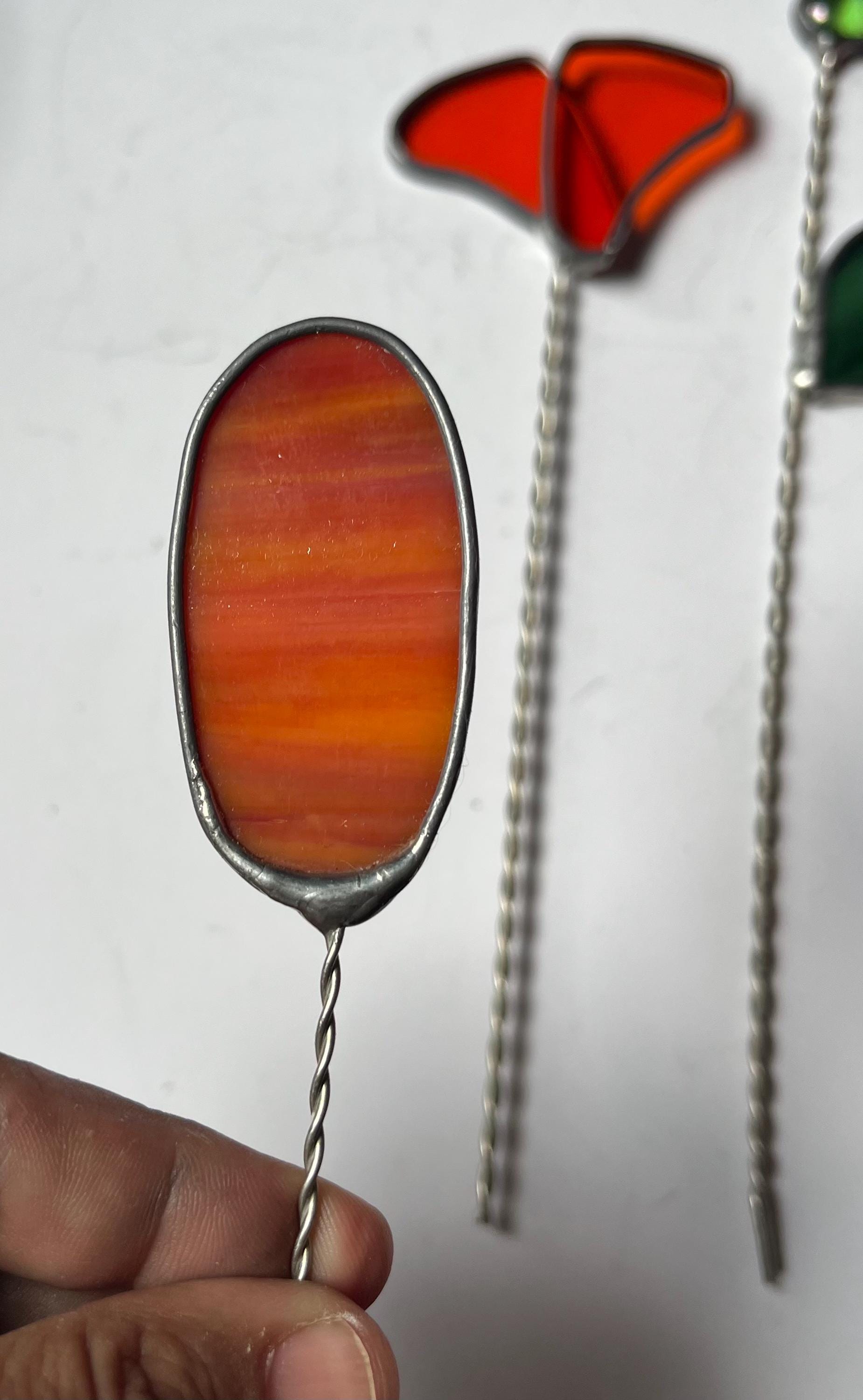 Forever flowers! These beauties will never wilt or fade. Made with mixed green wispy glass, topped with an iridescent green glass nugget and wrapped in lead came.