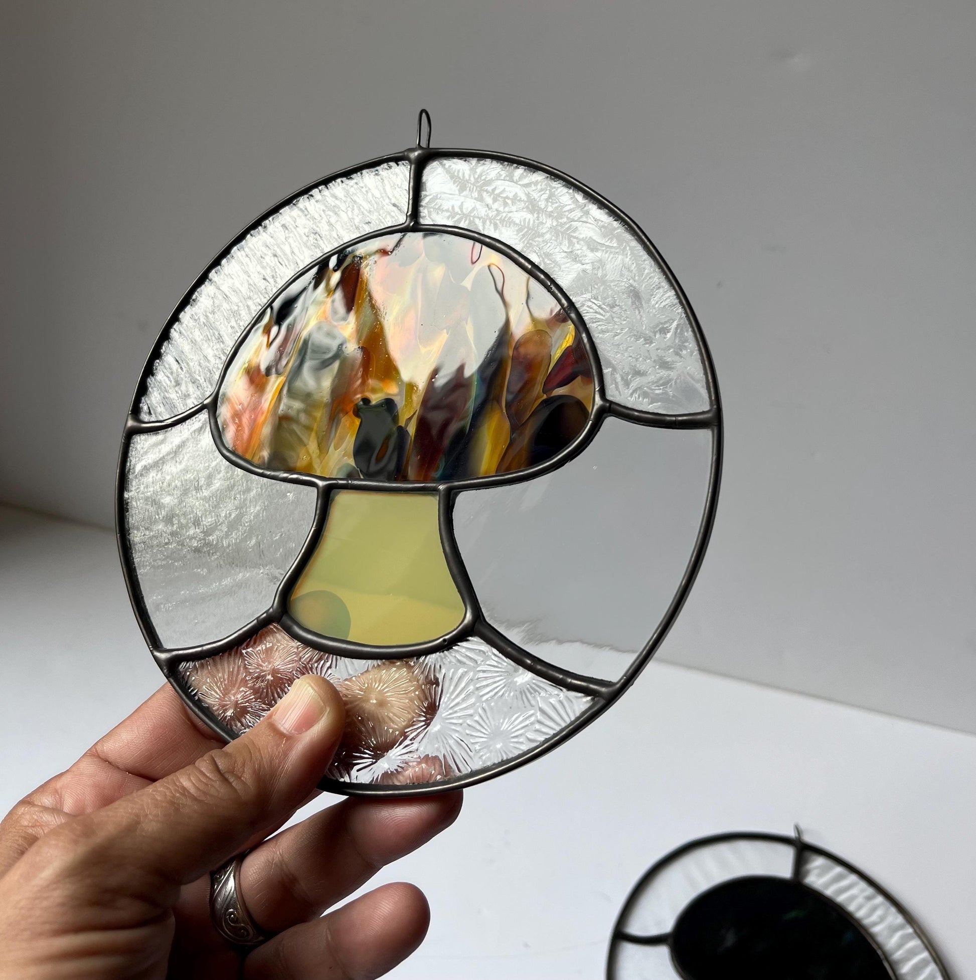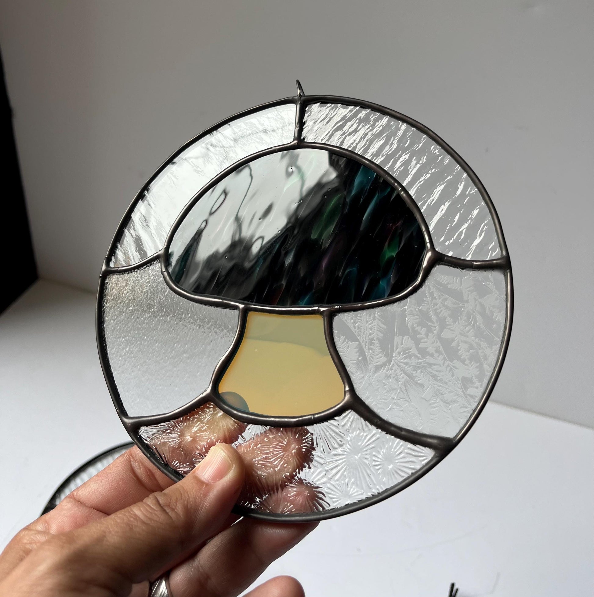 This is a gorgeous Mushroom round. it’s a 6” round piece wrapped in lead and finished with black patina. the Mushroom caps are made with assorted Fremont mouth blown glass. The stems are made with a color shift gold Fremont glass. Background glass is mixed clear textured glass.