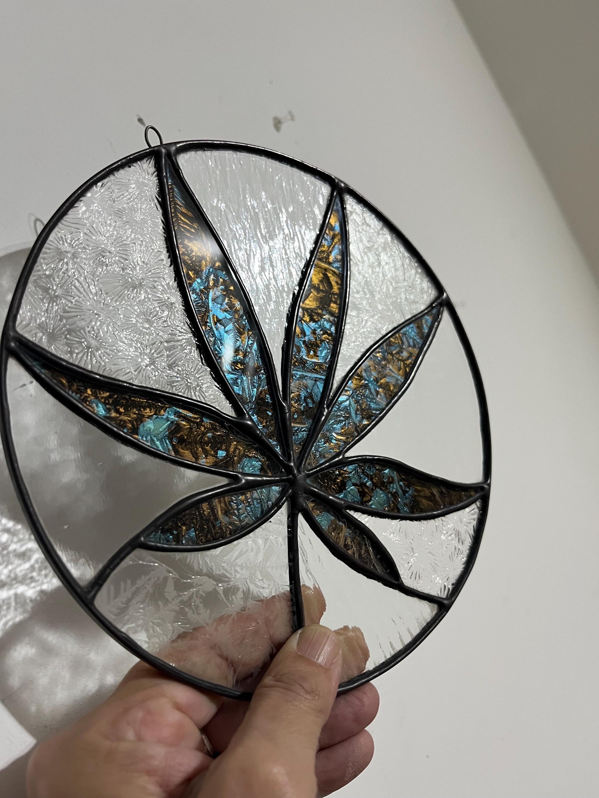 This is a gorgeous Sativa leaf round. it’s a 7” round piece wrapped in lead and finished with black patina. The leaf is made from Van Gogh glass . Background glass varies.