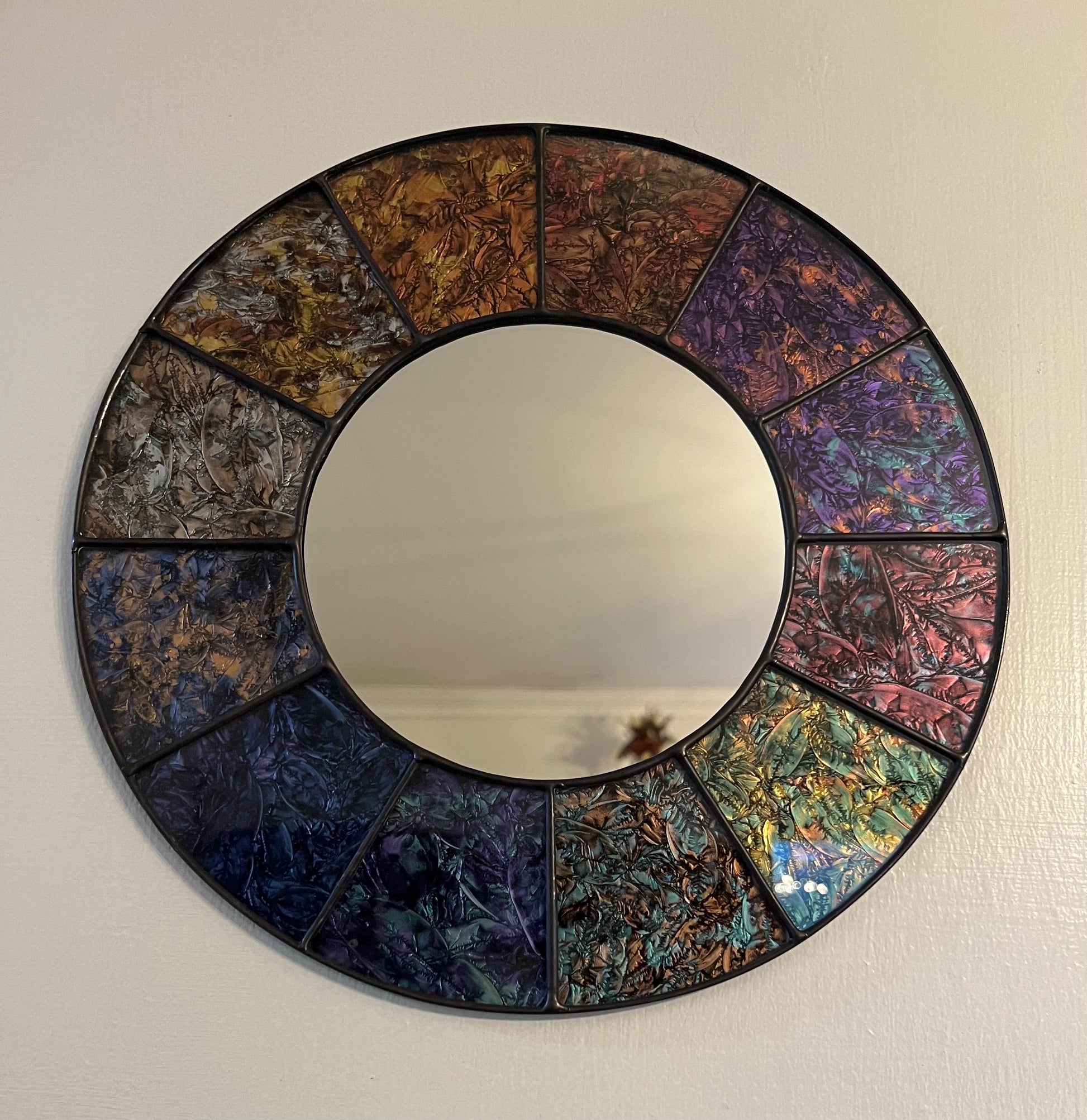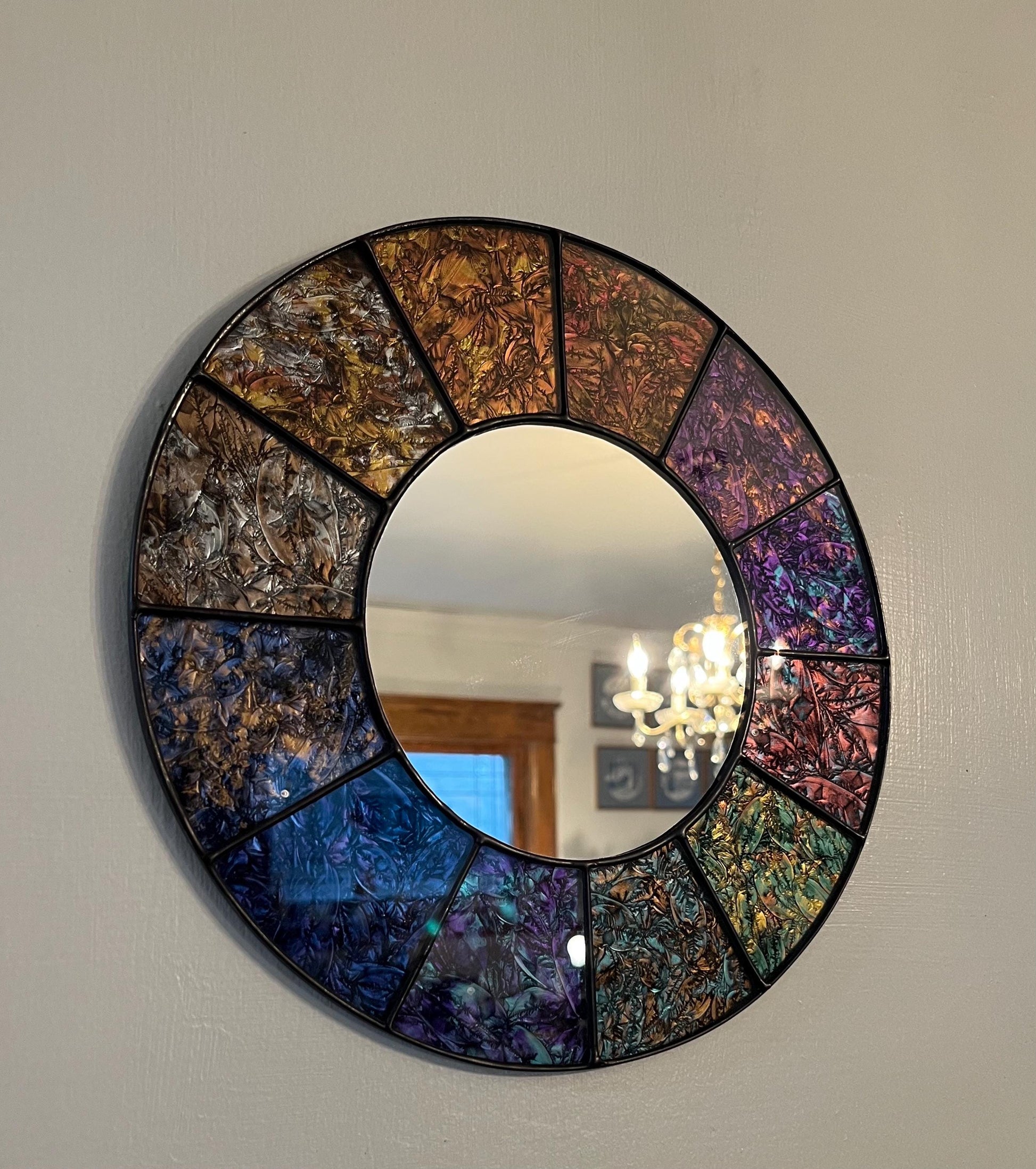 This is a handmade round stained glass mirror. The entire piece is 11x11”. Made with Vintage Van Gogh glass. 12 individual pieces of assorted glass frame this round hand cut mirror. Finished with lead came and black patina. Mirror is sealed for protection from scratches. Hook for hanging attached.