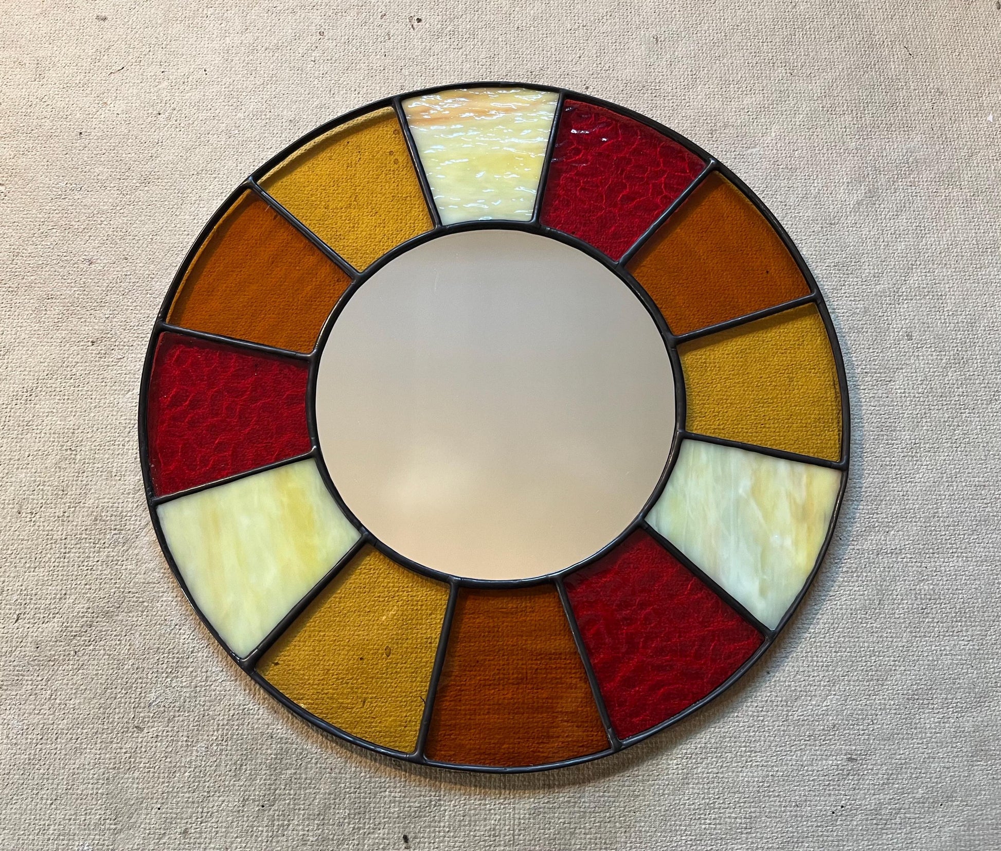 This is a handmade stained glass mirror. The entire piece is 11.5”. Made with Vintage Spectrum pale amber yellow, medium amber water glass, wispy opaque and copper red English muffle. 12 individual pieces of assorted glass frame this round hand cut mirror. Finished with lead came and black patina. Mirror is sealed for protection from scratches. Hook shown in the back for easy wall hanging. Perfect for a guest bath, a hallway or right next to your door for a quick peek!