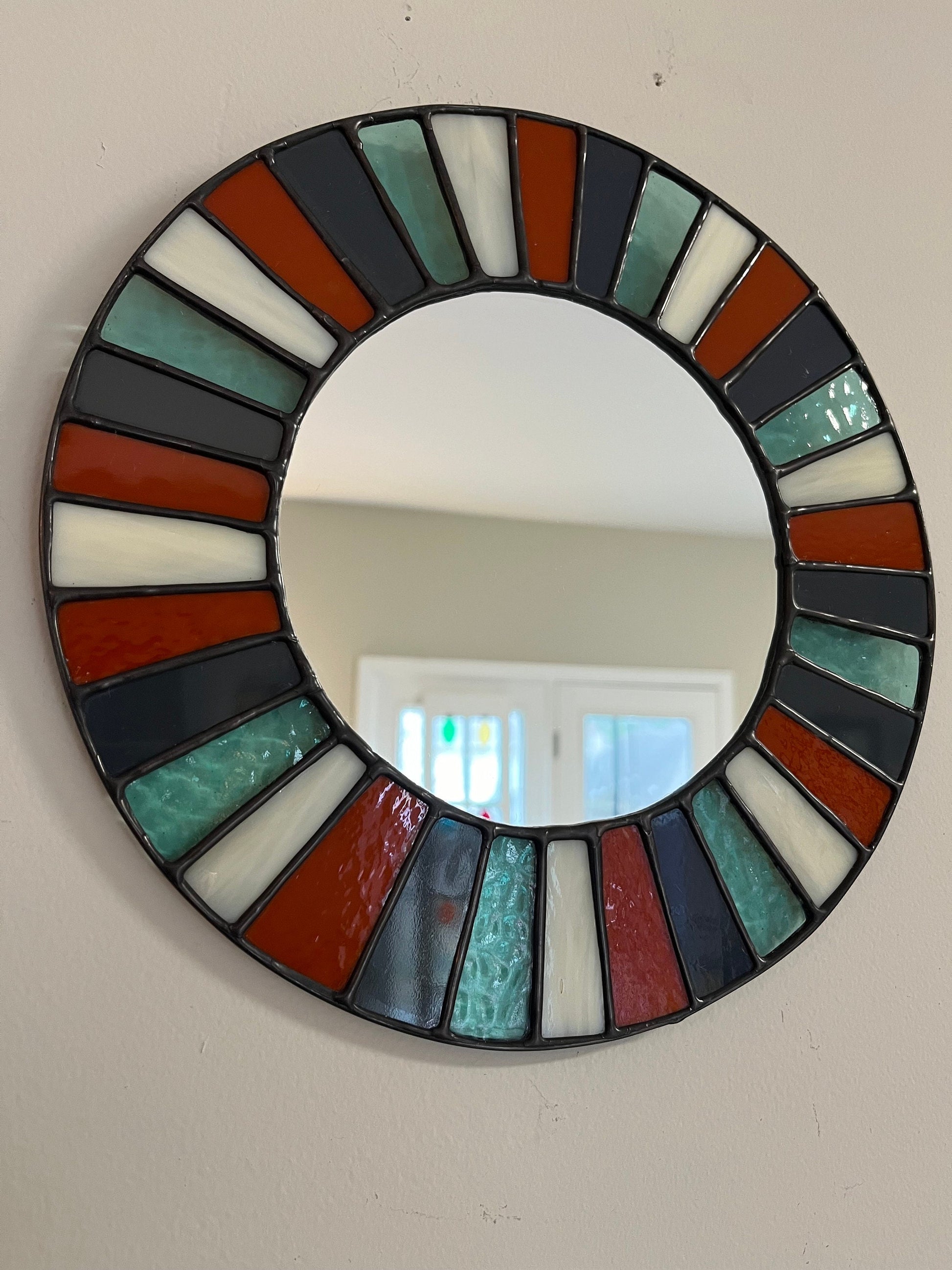 This is a handmade stained glass mirror. the mirror is 6” wide. The entire piece is 10”x10”. Made with Vintage and Modern glass. Opaque Terra Cotta and Charcoal glass, a semi opaque wispy Bone and a transparent textured Country blue. 34 individual pieces of assorted glass frame this round mirror. Finished with lead came and black patina. Mirror is sealed for protection from scratches. Hidden Hook in the back for easy wall hanging. Perfect for a guest bath, a hallway or right next to your door for a quick peek before you head out!