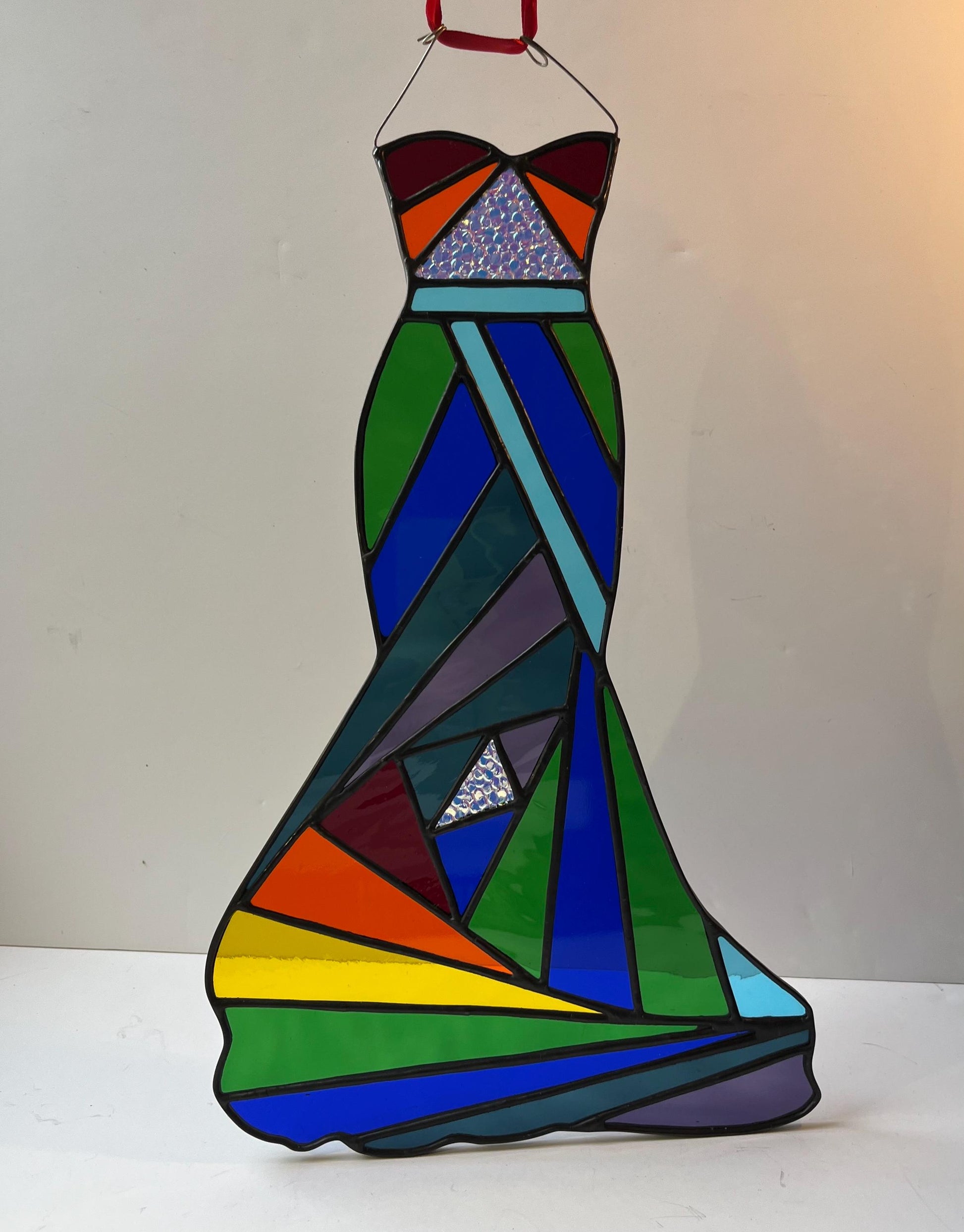 Stained glass Rainbow Ballgown. Made with Vintage Spectrum water glass and a trichroic pebble peep. Wrapped in lead and finished with black patina. It’s 15x9.5”.