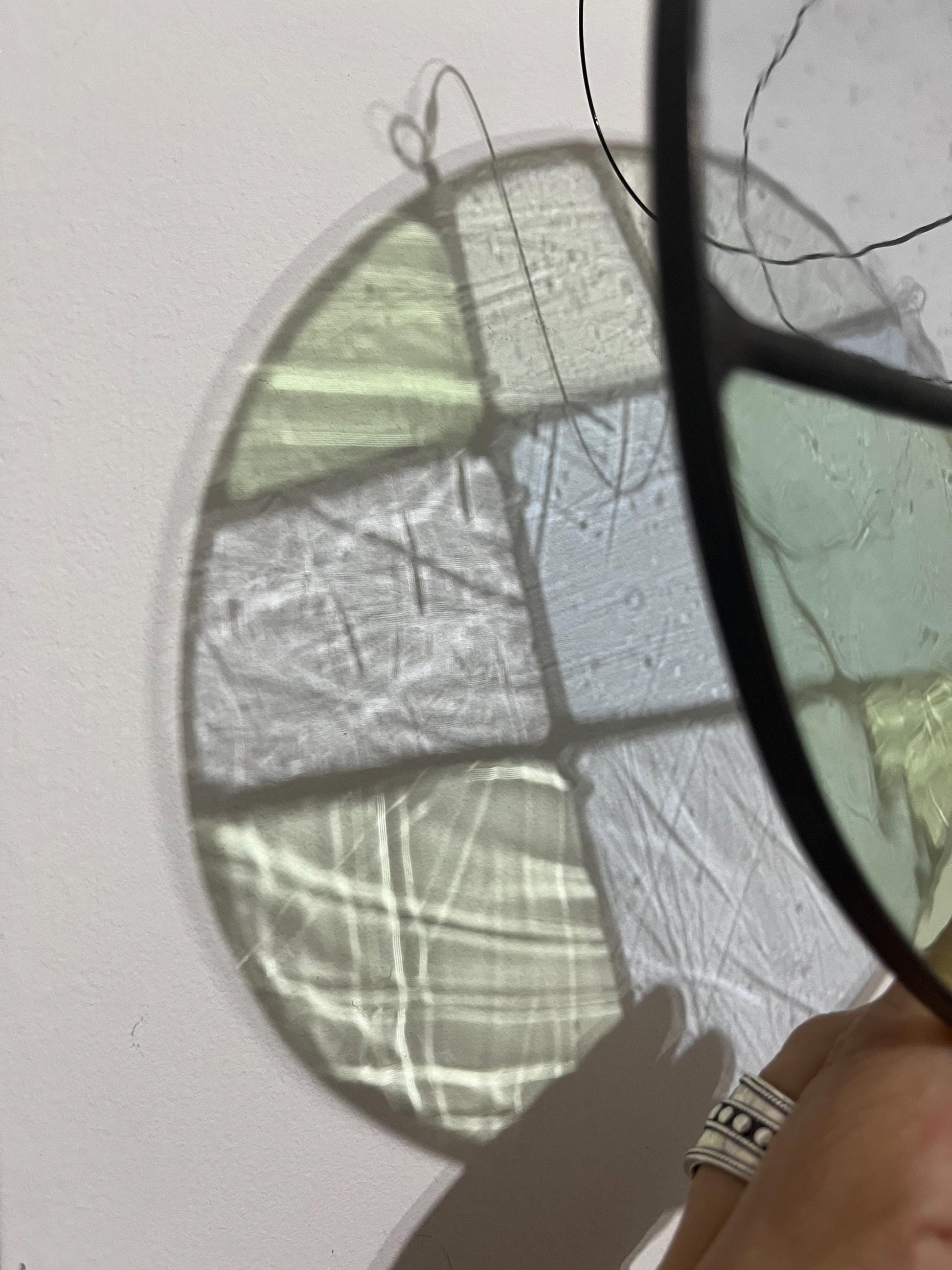 This is a gorgeous round abstract stained glass piece. The design is simple to showcase this stunning glass. It is made with hand blown Lamberts glass from Germany. The refractions from this glass are beyond STUNNING! This glass is very difficult to find in the US. It is priced accordingly. Wrapped in lead and finished with black patina. It’s 8”