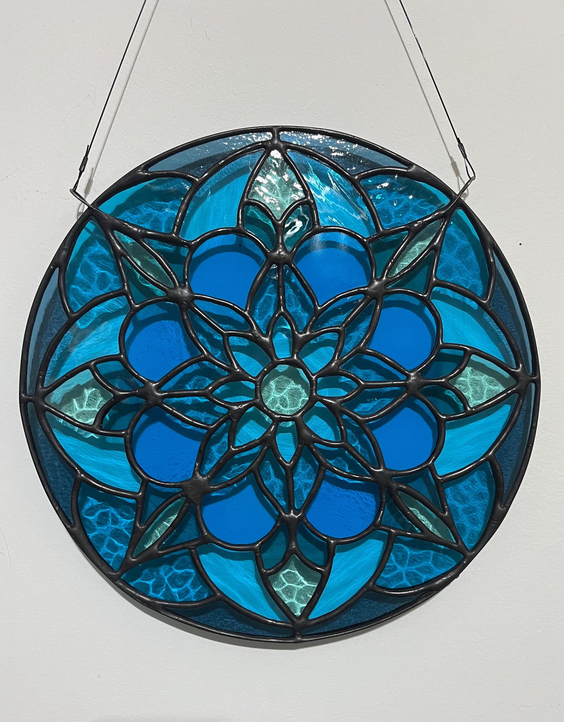 Stained glass Mandala panel. Made with different shades and textures of blue, turquoise and aqua. Wrapped in lead and finished with black patina. It’s 10”.