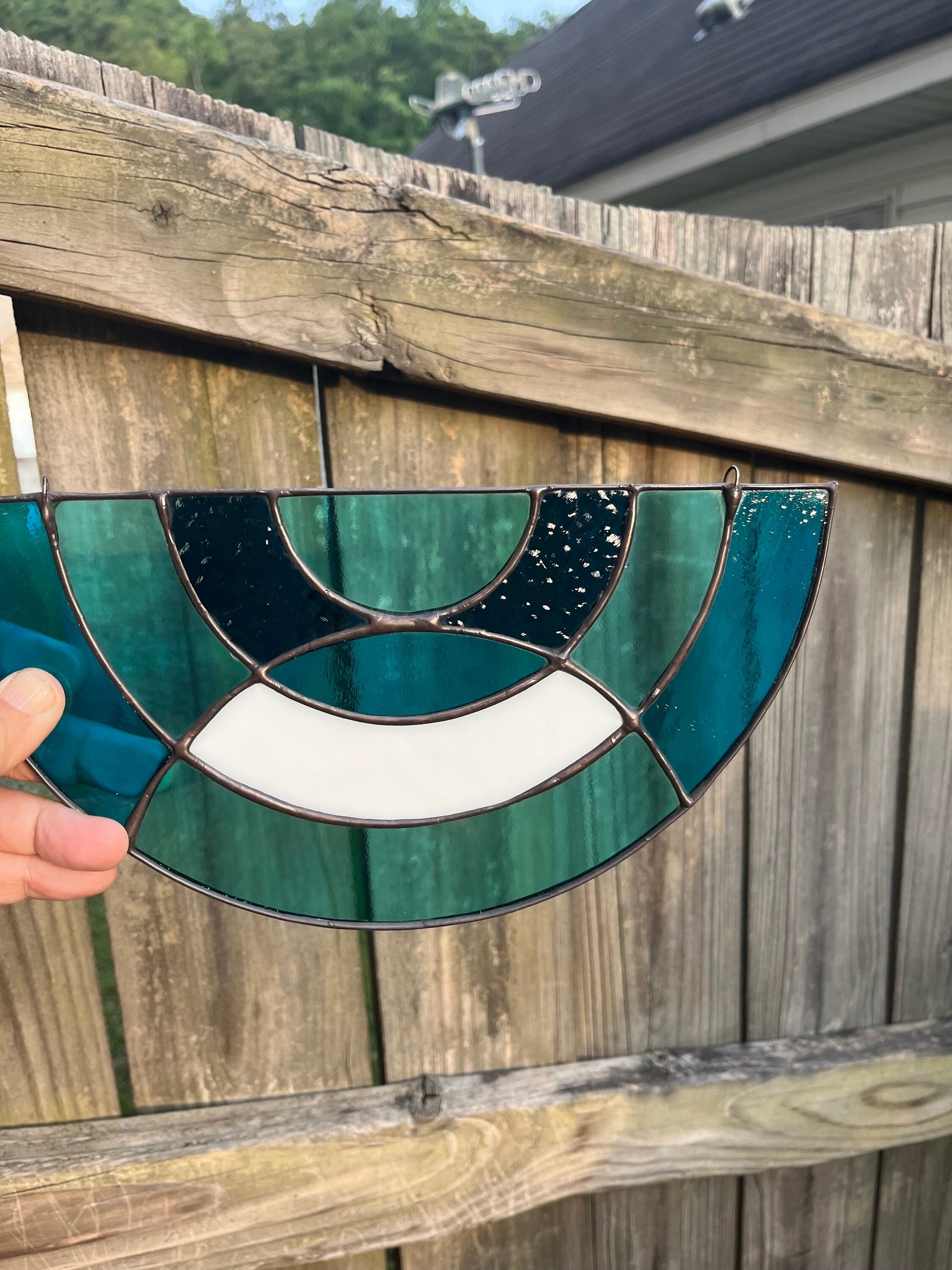 Stained Glass window panel. 10” x 5” made with Spectrum white opaque glass, Oceanside light aqua and deep teal. Silver patina, finished with lead.