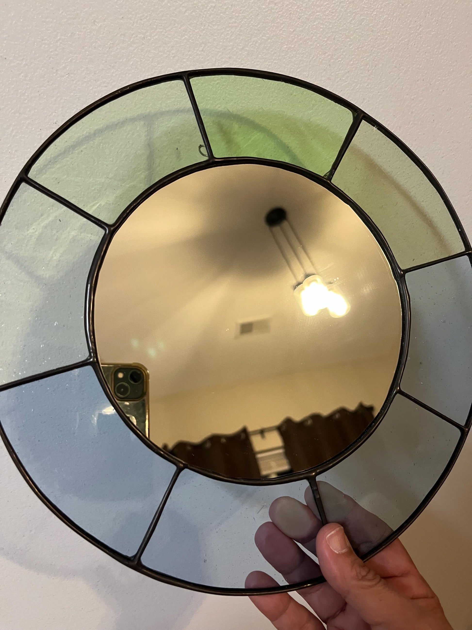 This is a handmade stained glass mirror. the mirror is 5.5” wide. The entire piece is 10.5”x10.5”. Made with imported Lamberts Glass, New Antique hand blown glass. This glass is very delicate and when holding your piece up, the colors are very pale. they are more intense when hung on a wall. Finished with lead came and black patina. Mirror is sealed for protection from scratches. Hook hidden in the back for easy wall hanging. Perfect for a guest bath, a hallway or right next to your door for a quick peek before you head out!