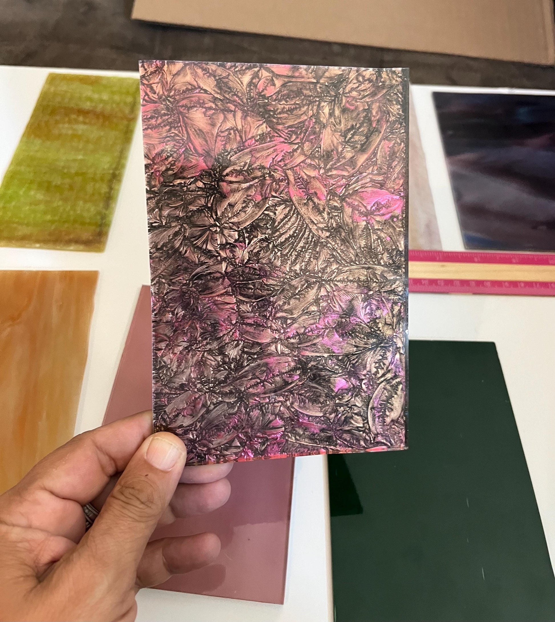 1- 4x6” Van Gogh pink and bronze glue chip