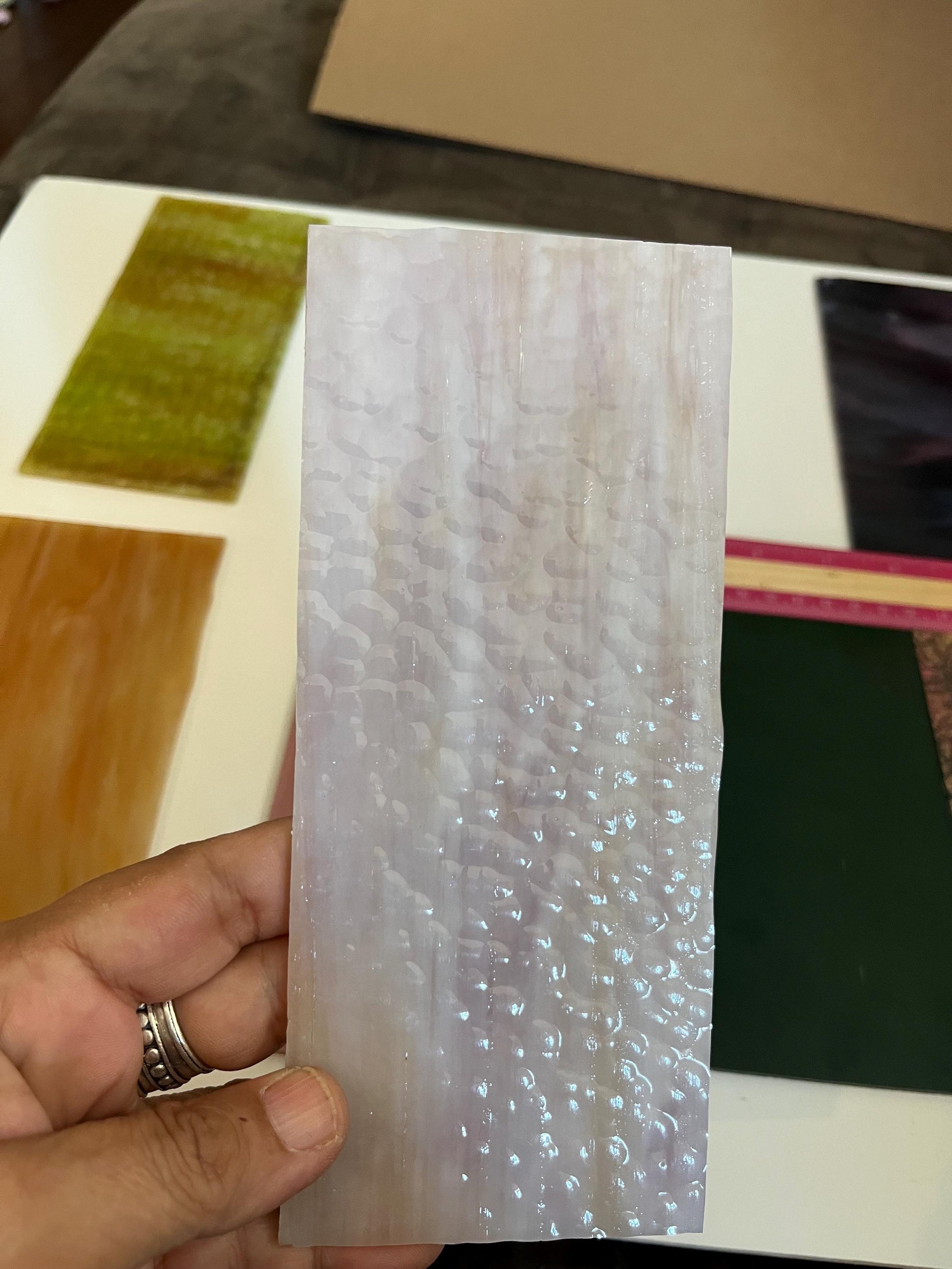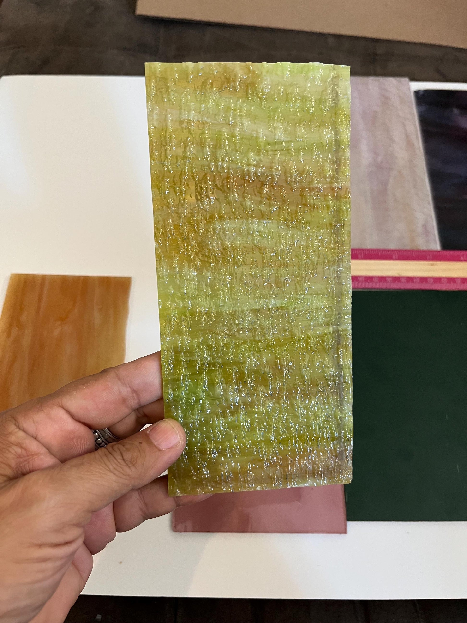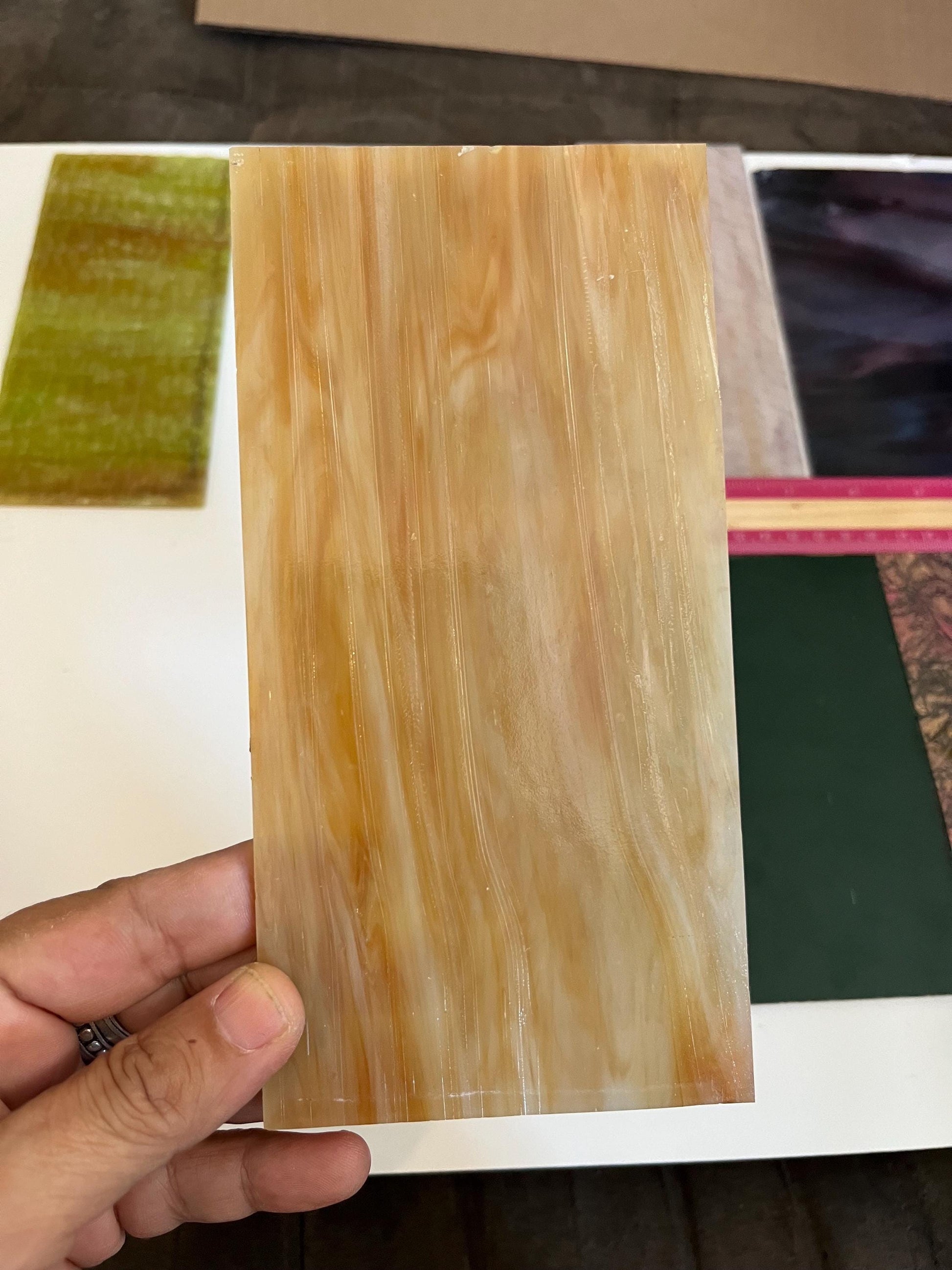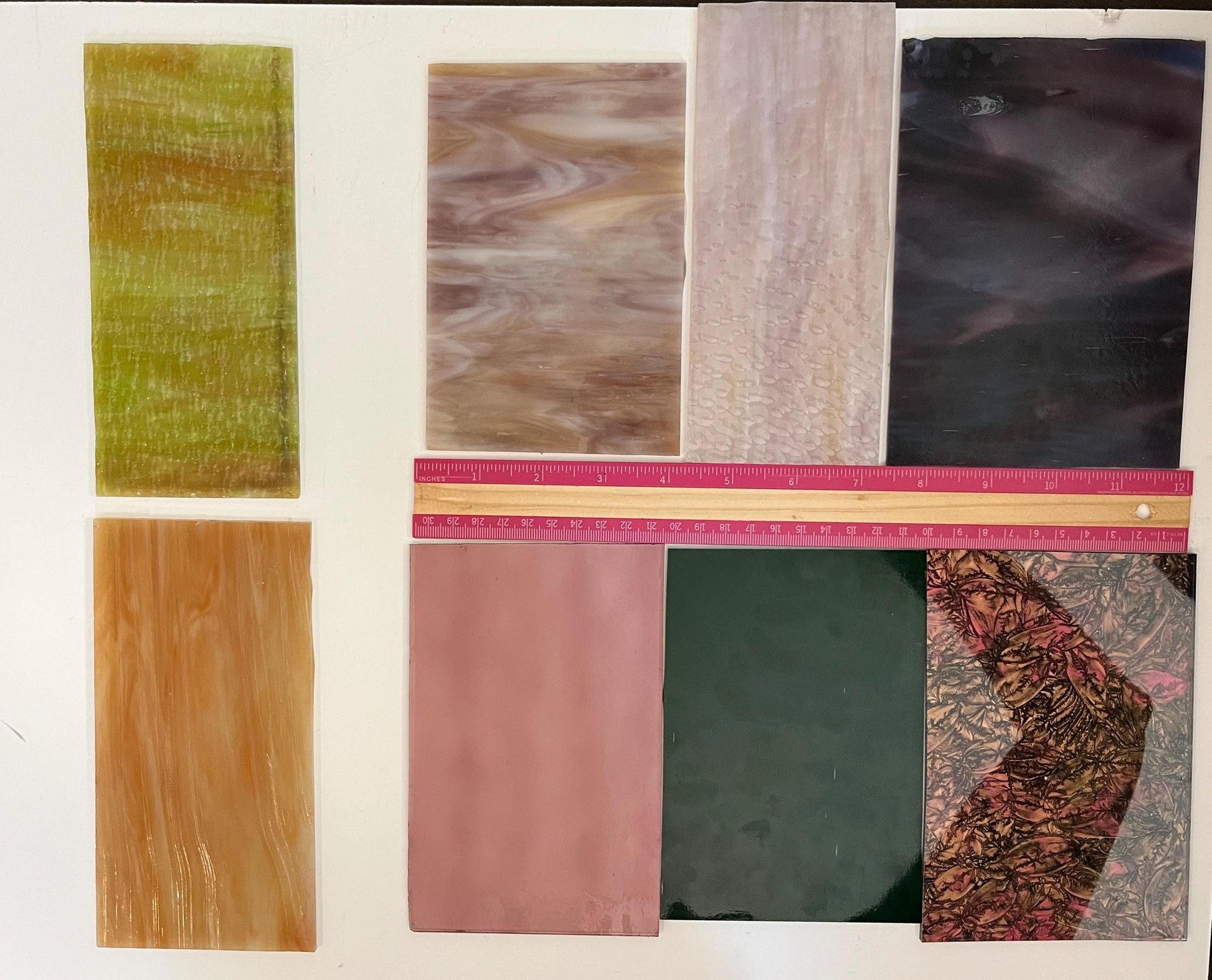 Very useful as a starter pack for beginner stained glass students and hobbyists who want to try lots of different shades and textures, without committing to a full sheet of glass!