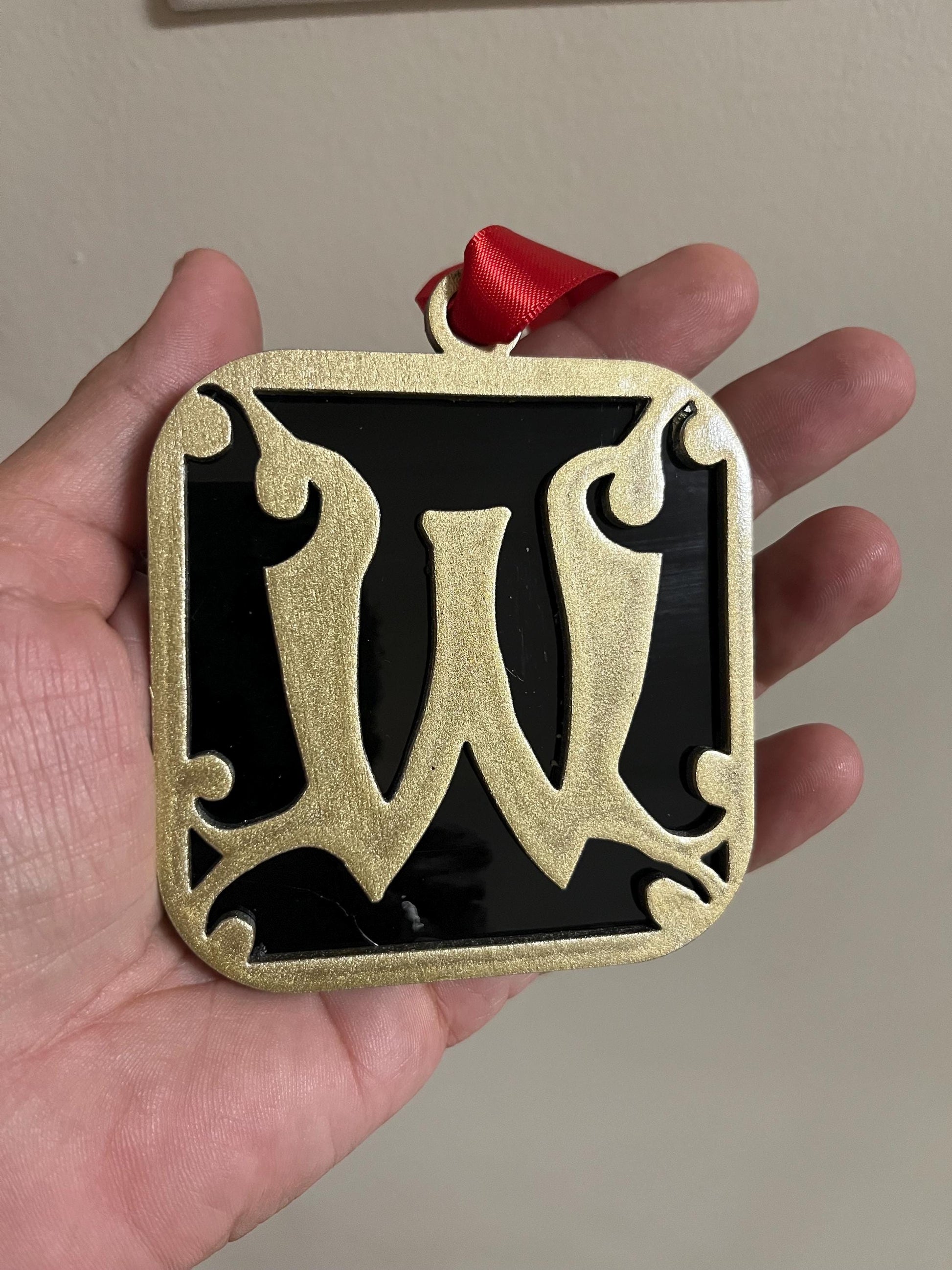 Our dear Wells College has closed. I have created a glass ornament memento as a nod to the old logo found on our rings. This W Logo piece is 3” wide and 3 1/2” tall. The wood overlay has been painted a glossy gold, is backed with opaque black water glass and hangs from a red satin ribbon. It can be hung from a holiday tree, or in a window or from a rear view mirror! This piece has no lead, and no soldering.